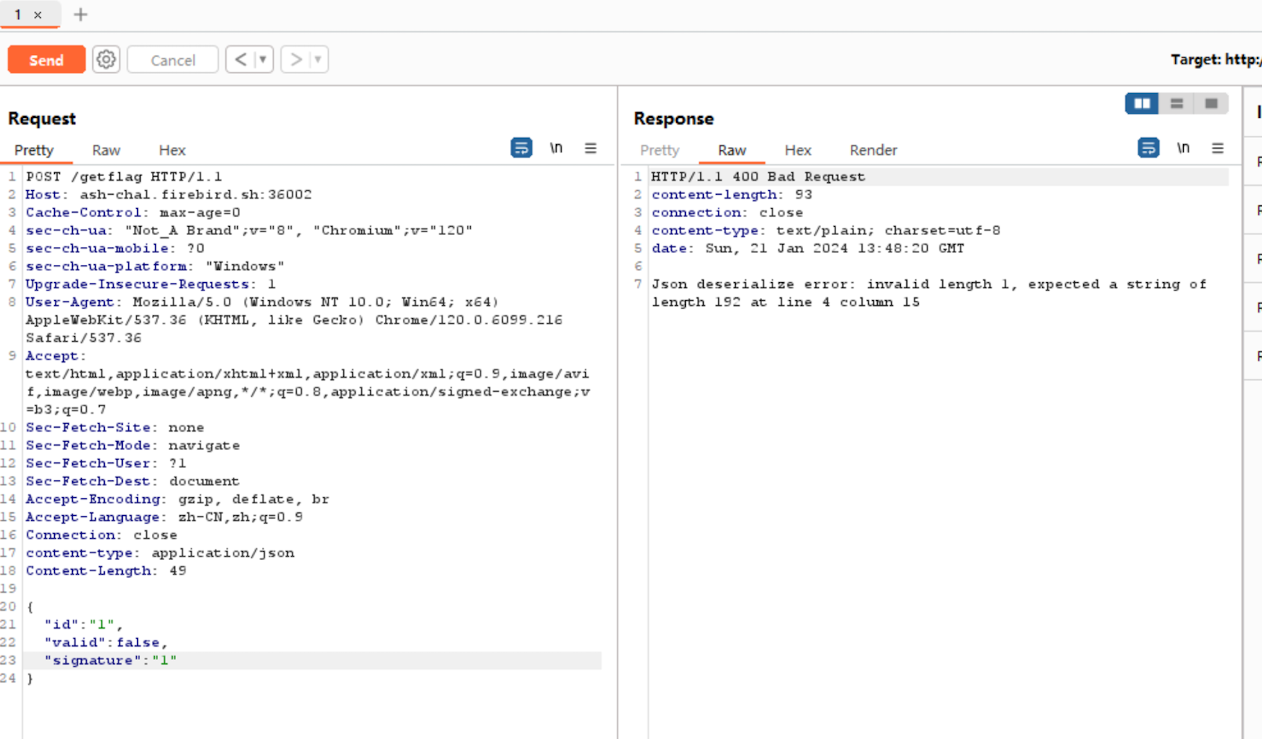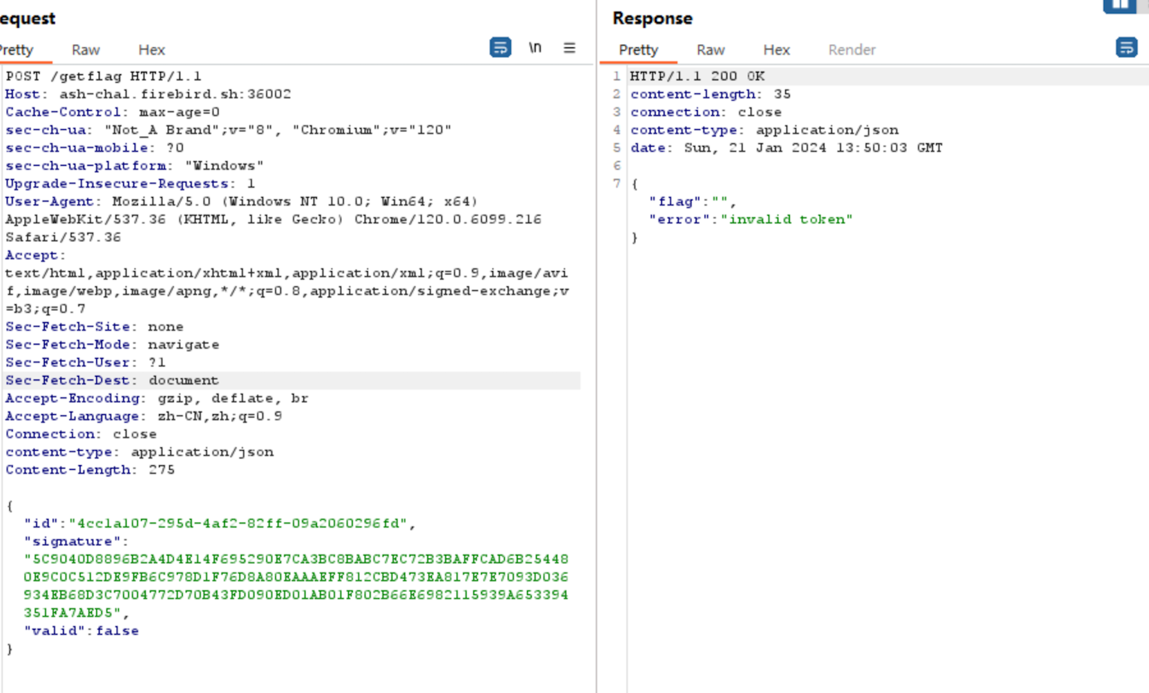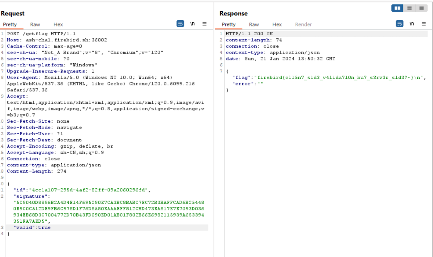 Finally, I send the following POST request to /getflag: