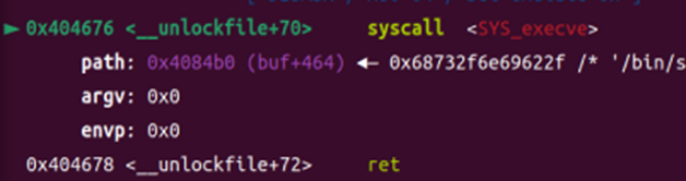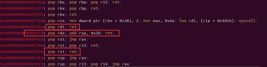All the registers are available, but the rdi register has an \x0a at the end, which is interpreted as the end of the string. This causes the ROP chain to be truncated. Additionally, the position of the bin_sh string is unknown, so the strategy is to first overflow and transfer control to the BSS section. Then, the ROP chain is laid out. Since pop rdi cannot be used directly, we have to manually search for a magic gadget that can assign a value to rdi.